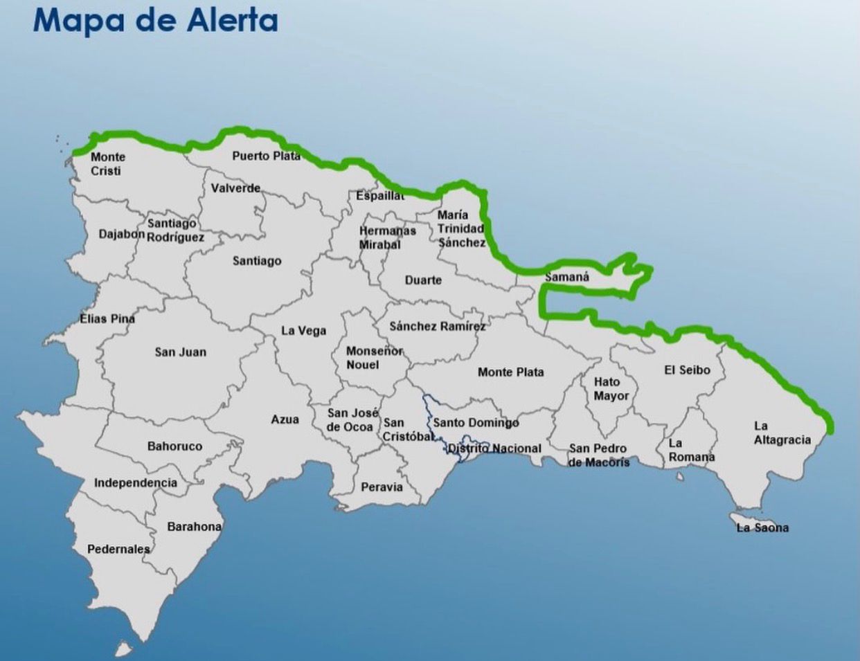 SANTO DOMINGO; El Centro de Operaciones de Emergencias (COE) emitió la noche de este lunes, un nivel de alerta verde ante la probabilidad de inundaciones costeras menores, con mayor riesgo durante los períodos de marea alta, para toda la franja costera que abarca desde Bahía de Manzanillo, en Montecristi, hasta Cabo San Rafael, en La Altagracia.