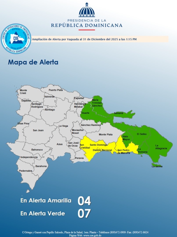 El Centro de Operaciones de Emergencias (COE) informó que desde ayer se mantiene tres provincias y el Distrito Nacional en alerta amarilla, mientras siete provincias, entre ellas La Altagracia, continúan en alerta verde, debido a las lluvias provocadas por una vaguada asociada a un sistema frontal.