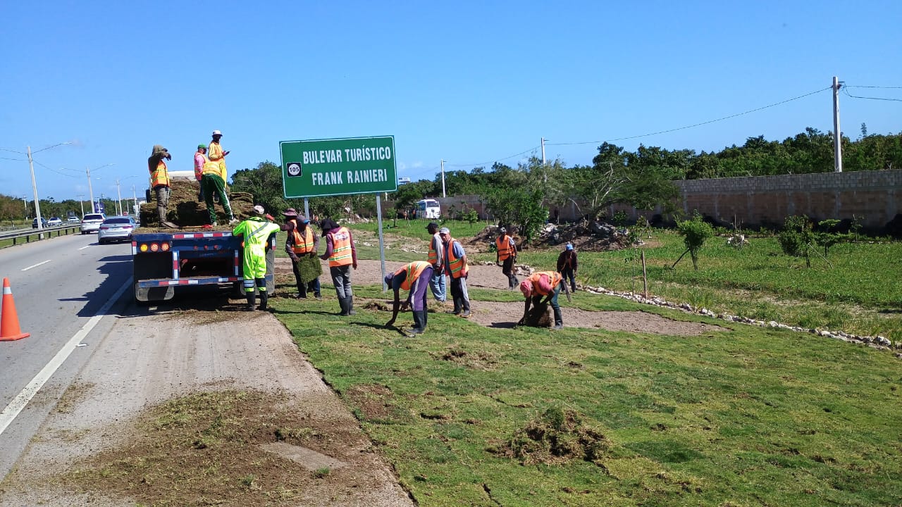 Durante la jornada de este día, los equipos de trabajo desmontaban y colocaban césped ornamental en áreas cercanas al letrero del Bulevar Turístico Frank Rainieri, como parte de un plan de mejora visual de la zona.