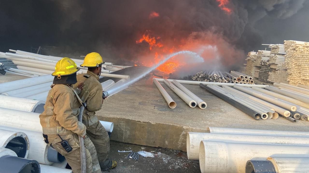 Según el informe preliminar, el fuego se desarrolla en un área con materiales altamente combustibles, incluyendo tuberías de PVC, lo que ha incrementado el riesgo de propagación hacia dos almacenes contiguos con alta carga de materiales inflamables.