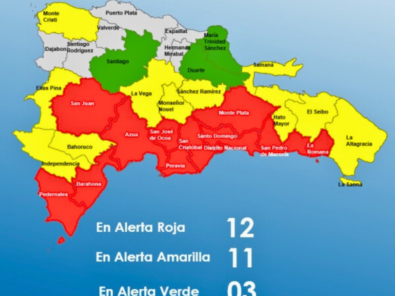 Las provincias en alerta roja son: Barahona, San Cristóbal, Santo Domingo, Distrito Nacional, San José de Ocoa, San Pedro de Macorís, San Juan, Azua, Peravia, Pedernales, La Romana y Monte Plata.En alerta amarilla se encuentran: La Vega, Samaná, Hato Mayor, El Seibo, Bahoruco, Monseñor Nouel, Sánchez Ramírez, Monte Cristi, Elías Piña, Independencia y La Altagracia.