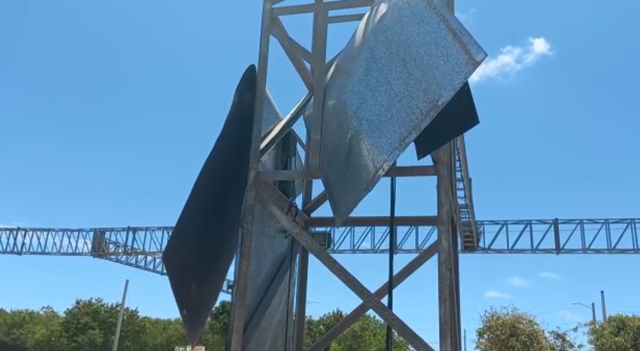 Verón. Las placas metálicas del semáforo de Los Manantiales están a punto de despegarse en su totalidad del semáforo de Los Manantiales, lo cual representa un riesgo para los conductores.