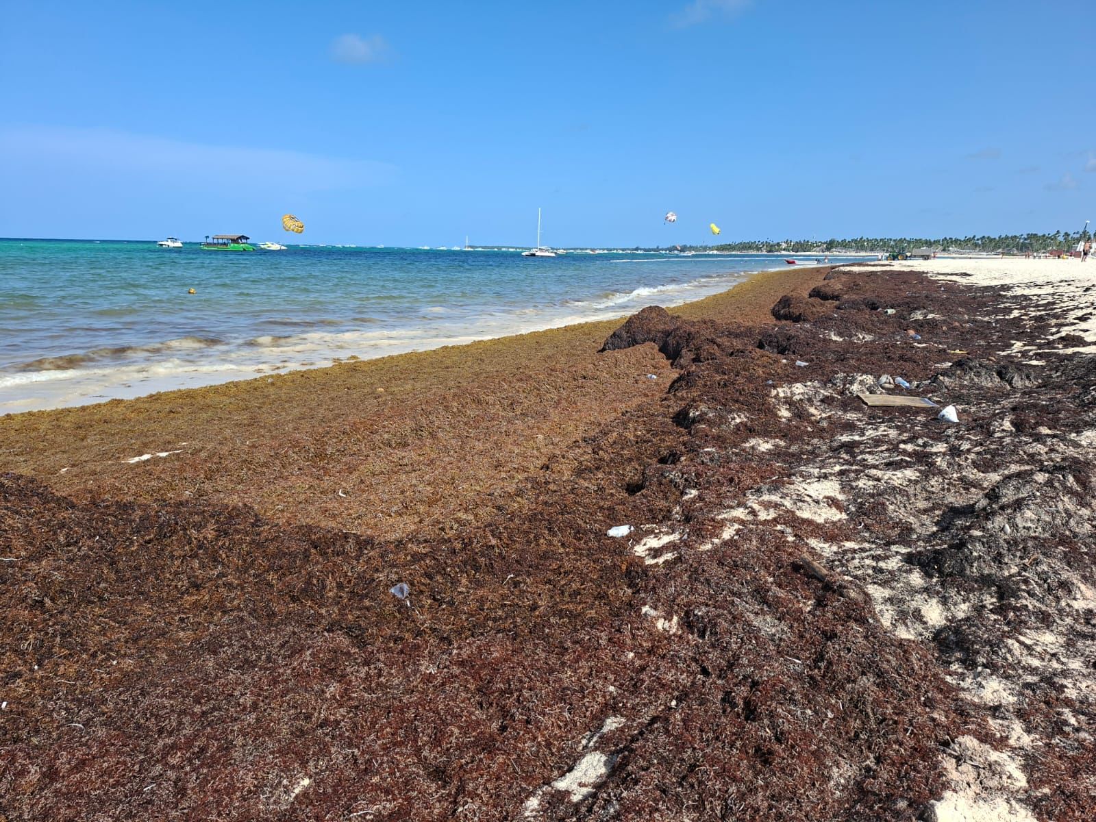Bávaro. En la playa Los Corales, ubicada en Bávaro, se observa una considerable acumulación de sargazo a lo largo de la orilla. El sargazo, amontonados sobre la arena y en la zona de entrada al mar, están afectando directamente el disfrute de los bañistas: muchos deben caminar sobre montículos para acceder al agua.