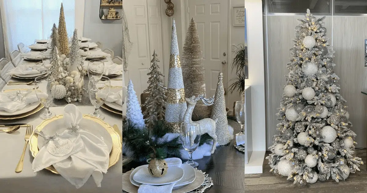 - Centros de mesa creativos: cree centros de mesa llamativos con velas, coronas navideñas, arreglos florales o incluso adornos colgantes. Los candelabros dorados o plateados añaden un brillo cálido.
